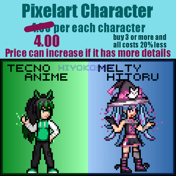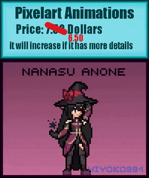 Minimum Price: 4.00 dollarsEl precio aumentará si lleva accesorios como armas, mascotas o tenga cosas como cola, orejas de algún animal, alas, etc.The price will increase if you carry accessories such as weapons, pets or have things like a tail, animal ears, wings, etc.Si compras 3 o más el precio disminuirá